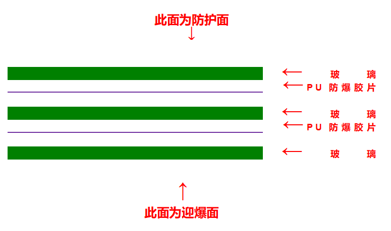 t 材料:由3層防火玻璃,2層PU防爆膠片結合而成。